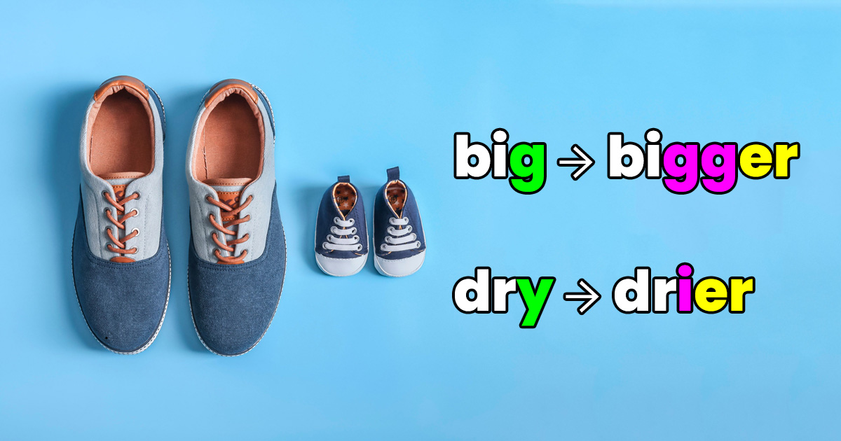 - Je-li poslední slabika tvořena písmeny souhláska + samohláska + souhláska (např. big, thin, hot), dochází ke zdvojení (bigger, thinner, hotter). Více v článku Zdvojování koncové souhlásky.