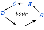 Podstatné jméno tour/'tʊə/ se používá pro cestu po nějakých památkách a podobně, konkrétně pro případ, že vyjdeme z jednoho bodu, jdeme po bodech A, B, C, D atd., a nakonec se vrátíme zpět. Může se jednat např. o okružní jízdu po městě, prohlídku hradu, prohlídku zajímavostí v okolí Londýna apod.
