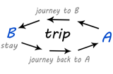 Slovo trip/'trɪp/ zahrnuje cestu z bodu A do bodu B, pobyt v bodu B a následnou cestu zpět do bodu A. Řekneme-li tedy, že taková cesta trvala celý den (The trip took all day), může to znamenat, že v dopravním prostředku jsem strávil např. pouze půl hodiny (tedy cesta tam mohla trvat 15 minut, cesta zpět také, ale pobyt na místě trval 23 hodin.)