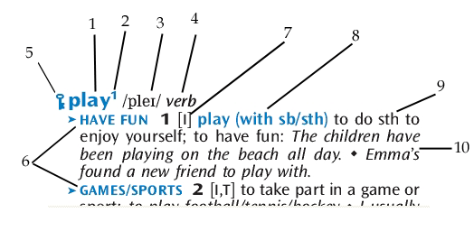 - homonyma - Číslo 1 vpravo nad vlastním heslem udává, že se jedná o první z více slov, která se píší a čtou stejně, ale mají jiný (zcela jiný) význam. PLAY 1 je zde sloveso (hrát, hrát si apod.), PLAY 2 potom bude postatné jméno (divadelní hra).