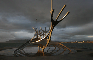 - In the foreground - v popředí (In the foreground we can see a strange monument that looks like an old Viking ship...)