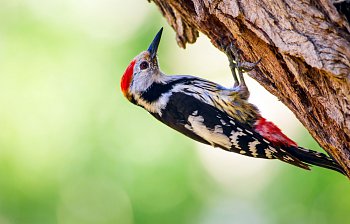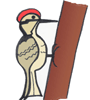 a bird with a long bill, it climbs trees and drums on them with its sharp bill to get food