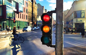 the system that directs the traffic at a place where two streets meet, it has three lights, green, yellow (amber) and red