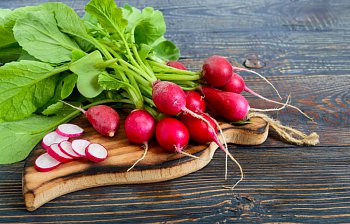a small red or white vegetable that grows underground, it has a strong taste and is usually eaten raw e.g. in salads etc.