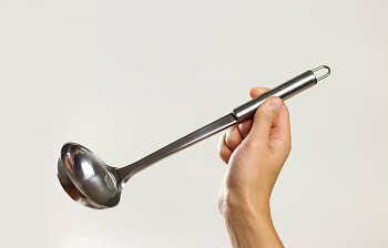 a kind of spoon with a long handle and a deep bowl at the end that is used for serving soups etc.