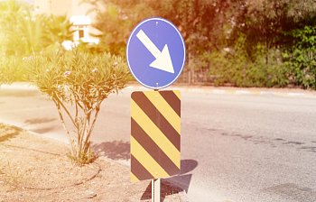 a sign placed by the side of a road that gives drivers warnings, informs them of restrictions, etc.