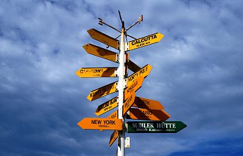 a sign placed on the side of a road that gives drivers information about distances, directions etc.; a sign with such information for hikers etc.