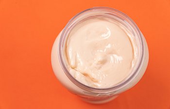 white or yellow sauce made from eggs and other ingredients, people often put it in salads etc.