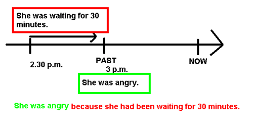 Často předminulý průběhový čas vyjadřuje nějaký děj, který vedl k nějaké situaci či nějakému stavu. Např.: