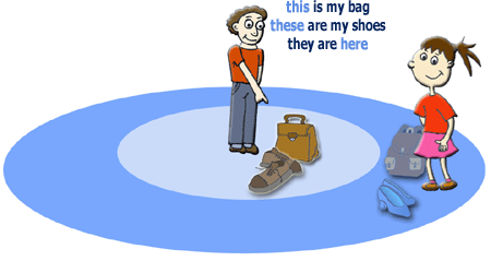 Tato dvě ukazovací zájmena se tedy používají pro předměty/lidi, které má mluvčí ‘u sebe’. Jsou prostě tam, kde je on. Z jeho pohledu jsou ‘tady’ (here). Podívejte se na následující obrázek: