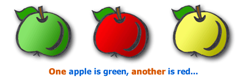 - one apple is green, another (apple) is red, another (one) is yellow, …