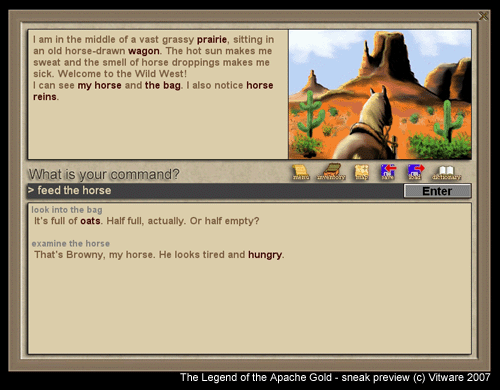 Hra se jmenuje THE LEGEND OF THE APACHE GOLD a odehrává se na divokém západě. Čeká vás dobrodružství, kde budete mít za úkol najít legendární poklad Apačů. K tomu se dostanete ale pouze s použitím rozumu, důvtipu a hlavně svých znalostí angličtiny.