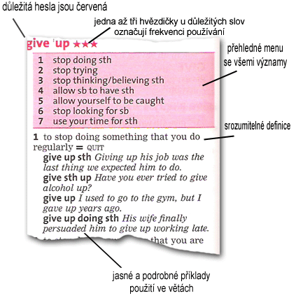 Definice jsou psané jednoduchým způsobem tak, abyste vždy přesně pochopili, co dané slovo znamená. Podobně jako slovník Macmillan English Dictionary, i tento používá pro své definice tzv. defining vocabulary, což je zásoba 2000 základních anglických slovíček. Definice jsou navíc ilustrované několika příkladovými větami. Díky nim ještě lépe každé frázové sloveso pochopíte a uvidíte, jak se skutečně používá. Věty jsou totiž zásadně jak se říká 'ze života'.
