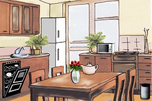 V této lekci se seznámíte se základními slovíčky, která popisují nábytek v kuchyni. Na obrázku, který naleznete níže, můžete myší ukázat na jednotlivé součásti místnosti a kliknout na ně, čímž v přehrávači spustíte zvukovou nahrávku. Zkuste se naučit slovíčka tak, že si je vždy sami řeknete a potom se zkontrolujete pomocí nahrávky.