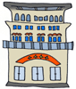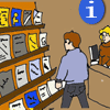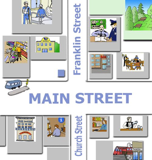 Na následující mapce si budeme později procvičovat orientaci ve městě. Nyní ji můžete využít pro zopakování slovíček obsažených v této lekci. Zkuste si dle obrázků pojmenovat všechny obchody a budovy, které na obrázku vidíte. Najedet-li na budovu myší, zobrazí se vám popisek. Klepnutím tlačítka myši spustíte nahrávku daného slovíčka.