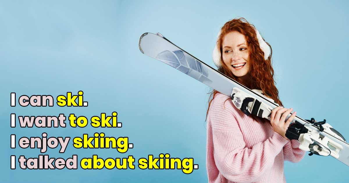 I enjoy skiing. – sloveso v gerundiu (-ing)
