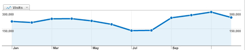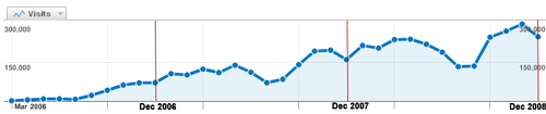 V tomto grafu vidíte vývoj návštěvnosti v tomto roce. Rekordní návštěvnost byla v listopadu 2008, kdy stránky Help for English zaznamenaly téměř 300.000 návštěv. Níže si můžete prohlédnout, jak se návštěvnost vyvíjela v průběhu celé existence stránek: