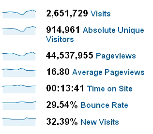 Vidíte zde, že naše stránky zaznamenaly za rok více než dva a půl milionu návštěv a téměř milion unikátních návštěv! Návštěvníci si u nás otevřeli celkem přes 44 milionů jednotlivých stránek, což činí v průměru 16.8 stránek na jednu návštěvu. Průměrná návštěva webu trvala necelých 14 minut.
