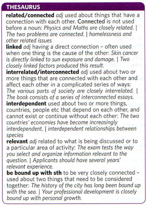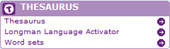Stejně jako tomu bylo u Collocations, i v případě Thesaura najdete u definic rámeček jako v tištěném slovníku, ale k tomuto tématu je také vpravo navíc barevné menu THESAURUS, kde najdete:
