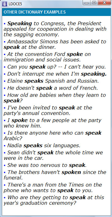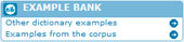 Další ikona se jmenuje EXAMPLE BANK. U většiny definicí ve slovníku najdete spoustu příkladových vět (které jsou dokonce namluveny). Jako bonus zde často najdete další příkladové věty a to ve dvou kategoriích: