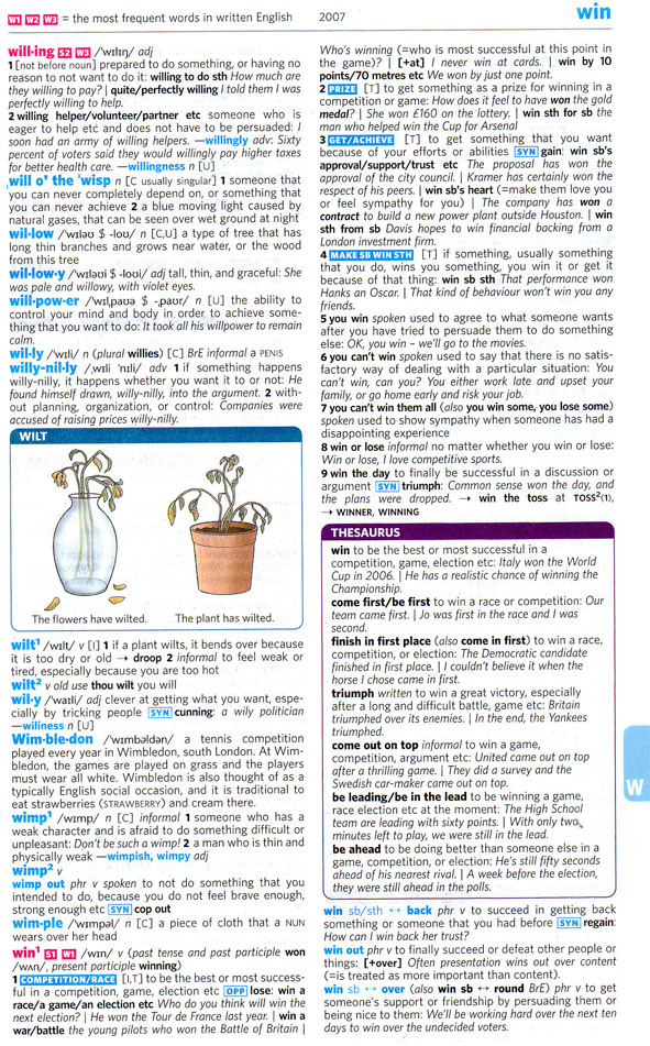Červeně jsou pak ve slovníku označena slovíčka, která patří do seznamu 3000 nejpoužívanějších slov psané či mluvené angličtiny. U těchto slovíček najdete červené značky s označením S1, S2 a S3 a pak W1, W2 a W3: