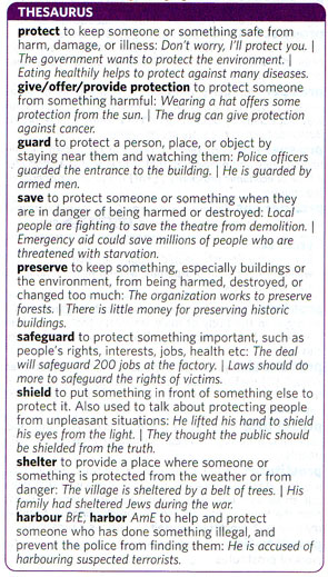 V takovém rámečku je hned několik slov a bylo by dosti neekonomické mít stejný rámeček pod všemi slovíčky, kterých se týká. Z tohoto důvodu naleznete rámeček Thesaurus u toho nejdůležitějšího z nich a u ostatních pak ve slovníku najdete jen odkaz THESAURUS s šipkou, u kterého slova jsou další informace.