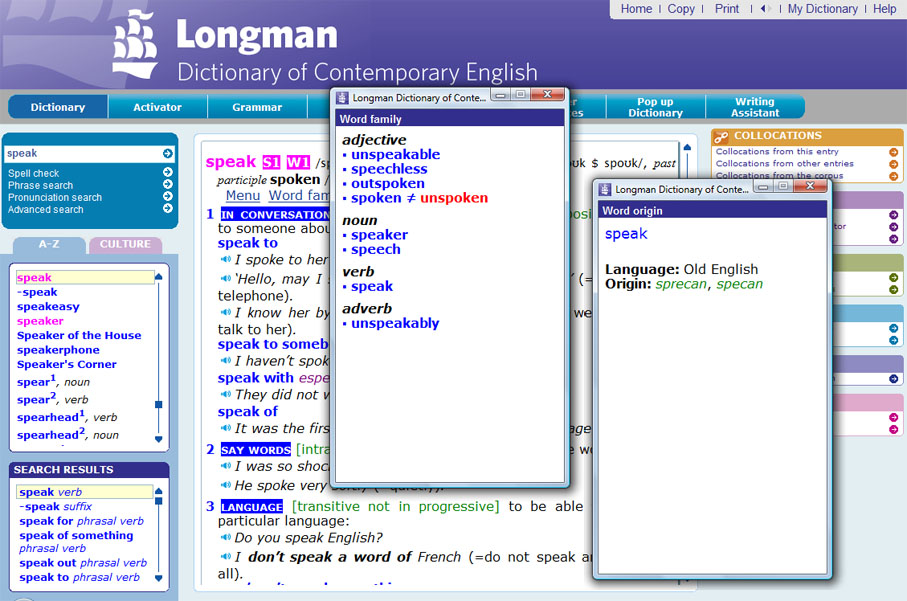 Pokud kliknete na Word Family, otevře se vám okno s dalšími slovními druhy s kořenem SPEAK (viz obrázek). Stačí kliknout a dostanete se na požadované slovo. Word Origin vám pak ukáže, z kterého slova vzniklo. V tabulce Verb Form pak uvidíte všechny tvary slovesa SPEAK.