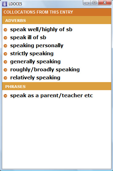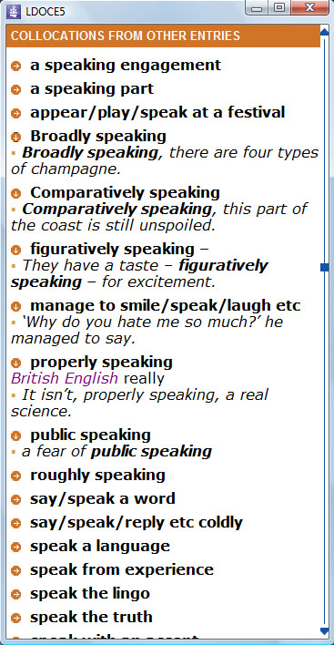 COLLOCATIONS (slovní spojení) je důležitou součástí papírového slovníku. Na DVD se však stává ještě přehlednější a objemnější (celkem 147,000). Kromě klasických okének Collocations, které znáte z papírového slovníku (viz náhled vpravo), naleznete také speciální část věnovanou kolokacím v barevném menu vpravo. Jsou zde následující odkazy: