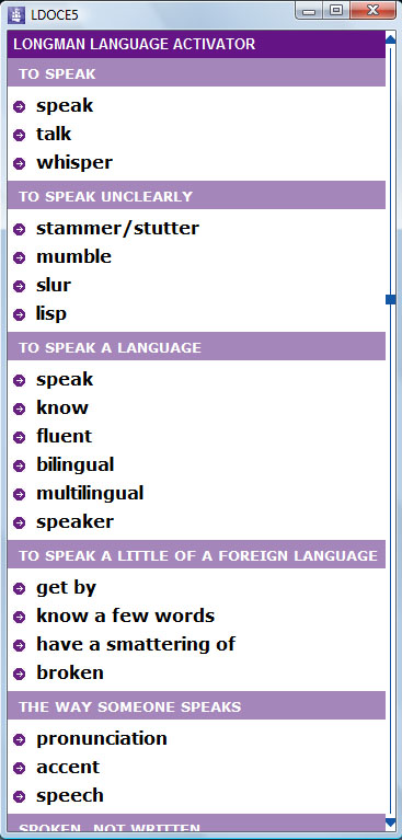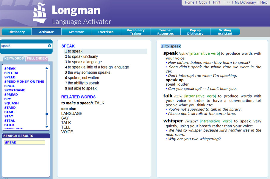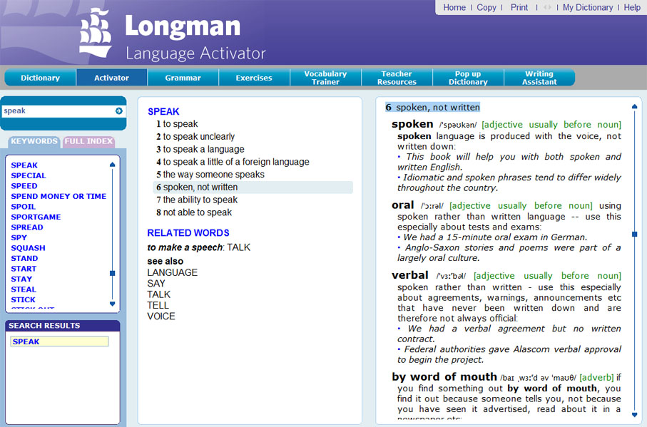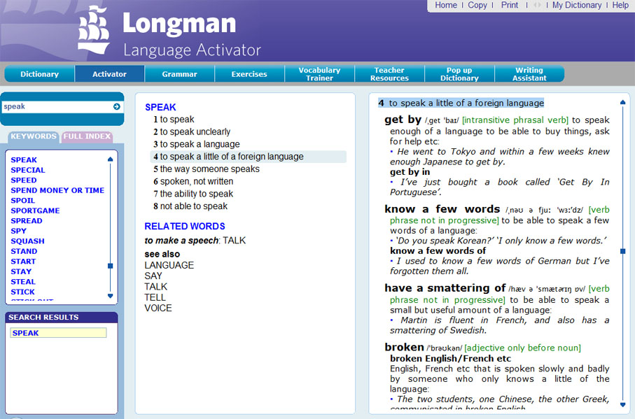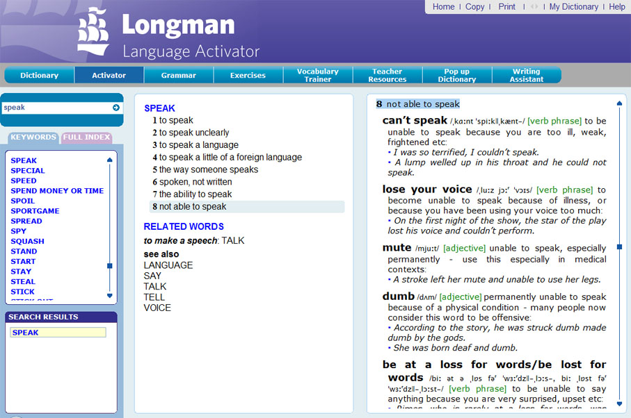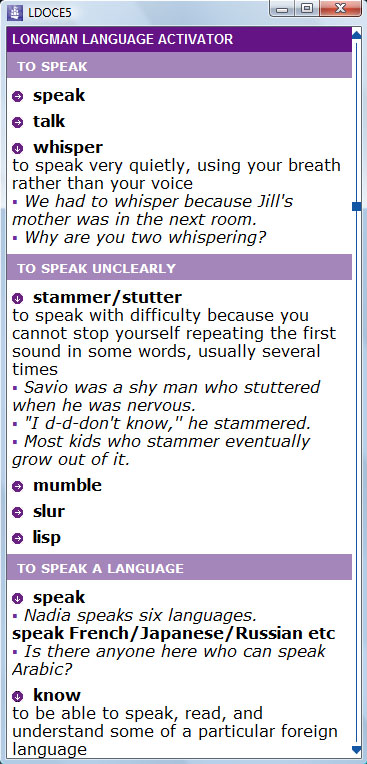 Opět použiji slovíčko SPEAK. Po zadání tohoto slova se vám objeví v prostředním sloupci osm sekcí, kde si můžete zvolit význam, který hledáte. Po kliknutí na požadovanou definici se v pravém sloupci objeví slovíčka stejného významu. Zde je několik náhledů: