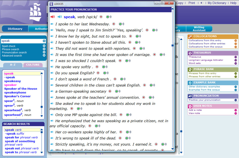 Po kliknutí na tuto ikonu se vám otevře okno se všemi příkladovými větami k danému výrazu. Za každou větou je červené nahrávací tlačítko a zelené přehrávací. Můžete si tak jednoduše poslechnout libovolnou větu a pak se snažit co nejlépe ji napodobit. Dělejte to tak dlouho, dokud nebude spokojeni s vaší nahrávkou.