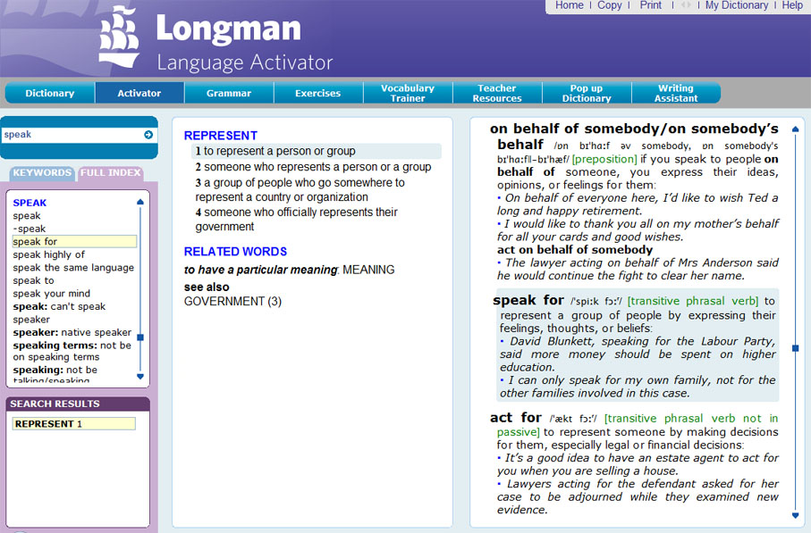 Pokud znáte konkrétní slovíčko, ke kterému hledáte synonyma, stačí jej zadat do části FULL INDEX. Já jsem zvolil SPEAK FOR. V prostředním sloupečku se nám objevila hlavní sekce REPRESENT a vpravo pak SPEAK FOR s definicí a další výrazy, které lze použít.
