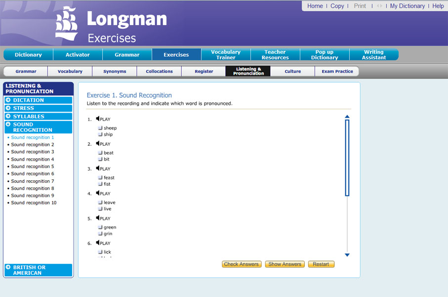 Jak jsem zmiňoval výše, všechny příkladové věty u definicí mají zvukovou stopu. Můžete si tedy zlepšovat i poslechové dovednosti (listening comprehension). V části PRONUNCIATION si můžete také zlepšovat svou výslovnost.