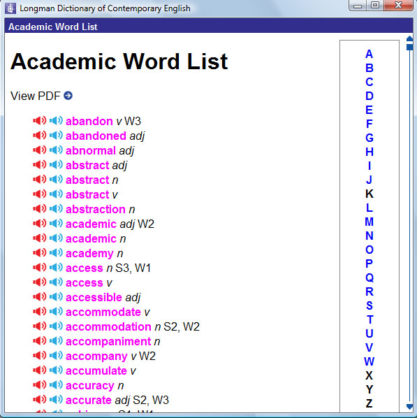 Červenou značkou AC jsou označena ve slovníku akademická slovíčka. Zde naleznete jejich kompletní seznam včetně britské a americké výslovnosti a možnosti si jej stáhnout ve formátu PDF.