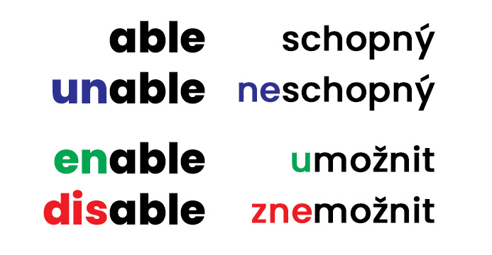 Důležité je hned v úvodu zmínit, že slůvka able a unable jsou přídavná jména, ale slova enable a disable jsou slovesa.
