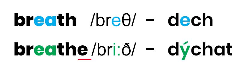 Nezapomeňte také, že th se vyslovuje u každého slova jinak. U podst. jména breath/'breθ/ je na konci neznělé /θ/. Sloveso breathe/'bri:ð/ je zakončeno znělým /ð/.