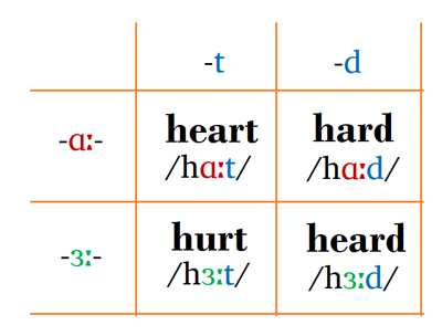 Pozn.: V tabulce vidíte britskou výslovnost. V americké je slyšitelné /r/, tedy /hɑ:rt/, /hɑ:rd/, /hɜ:rt/, /hɜ:rd/.