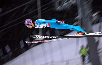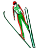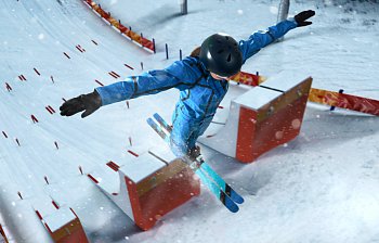 a winter sport in which the skiers ski off 2-4 metre jumps, spinning, somersaulting etc. in the air