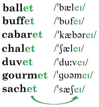 Angličtina přejala mnoho slov z francouzštiny. Mnoho z těchto slovíček má pro studenty do určité míry zapeklitou výslovnost. Do této kategorie patří i slova končící na -ET.