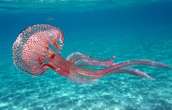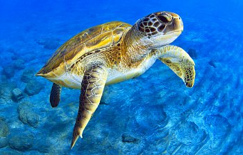 an animal that usually lives in water, has a large hard shell on its back and short legs
