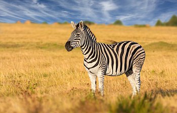 an African animal that looks a little like a horse, it is white and has long black stripes