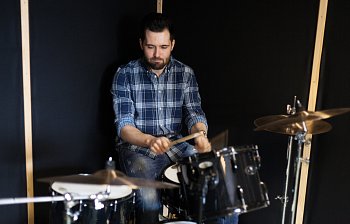 rhythm in music, usually kept by a drum