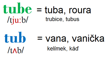 První slovíčko je tedy tube/'tju:b/, což je tuba, trubka, nebo další spousta předmětů podobného tvaru (různého materiálu).
