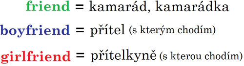 Pamatujte si, že angličtina má pro kamaráda i kamarádku stejný výraz (friend). Pokud však s někým chodíte, použijete slovíčka boyfriend nebo girlfriend.