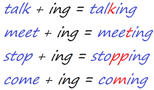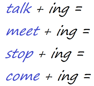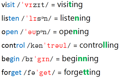 V našem úvodním cvičení jsme si vybrali zdvojování koncové souhlásky před příponou -ing. Zdvojuje se ale i jinde, o čemž si řekneme později.