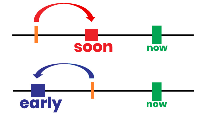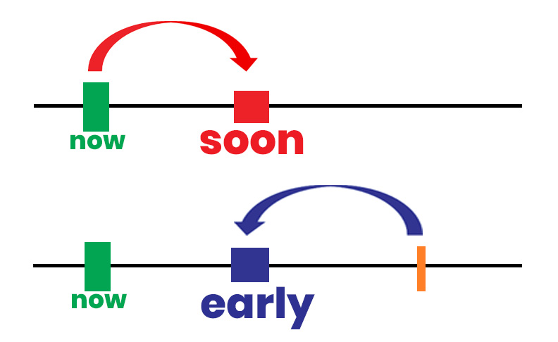 Naopak u slovíčka early šipka vede z nějakého bodu zpět. Něco se stane dříve, než než bylo zamýšleno, domluveno apod.