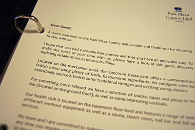 Tuto složku hledejte většinou na psacím stole. Uvnitř na první straně najdete uvítací dopis hotelu (foto níže), vlevo v kapse pak psací papír, obálky, informace o věrnostním programu apod.