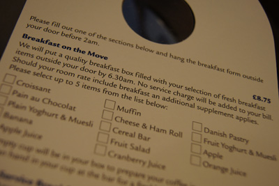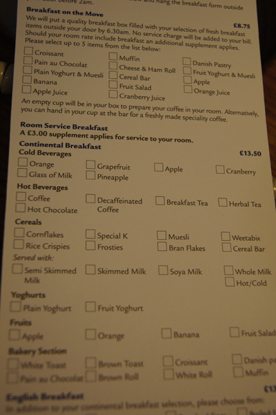 Jak vidíte na kartičce, za donášku na pokoj zde připlatíte tři libry. Zde doporučuji náš článek Hotel breakfast, kde se přesně dozvíte, co znamená continental breakfast, full English breakfast, buffet breakfast a také a la carte breakfast.