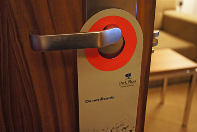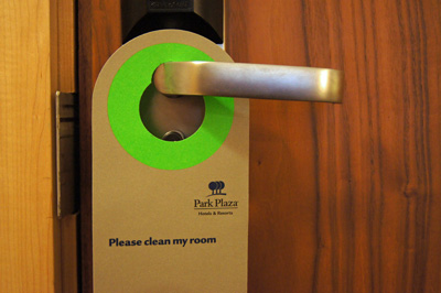 Čas může být jiný, ale většinou je nutno kartičku pověsit za dveře do jedné až třetí hodiny ráno. Zaměstnanec hotelu je pak posbírá a vy se můžete ráno těšit na snídani.
