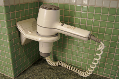 Ve většině středně a více kvalitních pokojů najdete fén na vlasy = hair dryer / blow dryer. Někdy je umístěn ve stojánku přímo v koupelně (viz foto), jindy ho však musíte hledat ve skříňce či šuplíku.