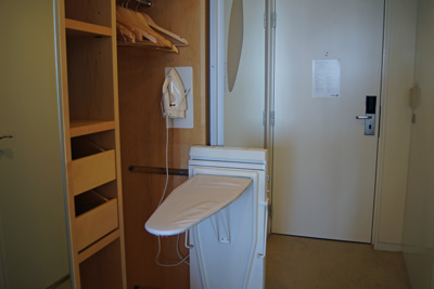 Na pokoji občas také najdete žehličku (iron) i žehlicí prkno (ironing board), které jsou často chytře nainstalovány do skříně (jak vidíte na obrázku).